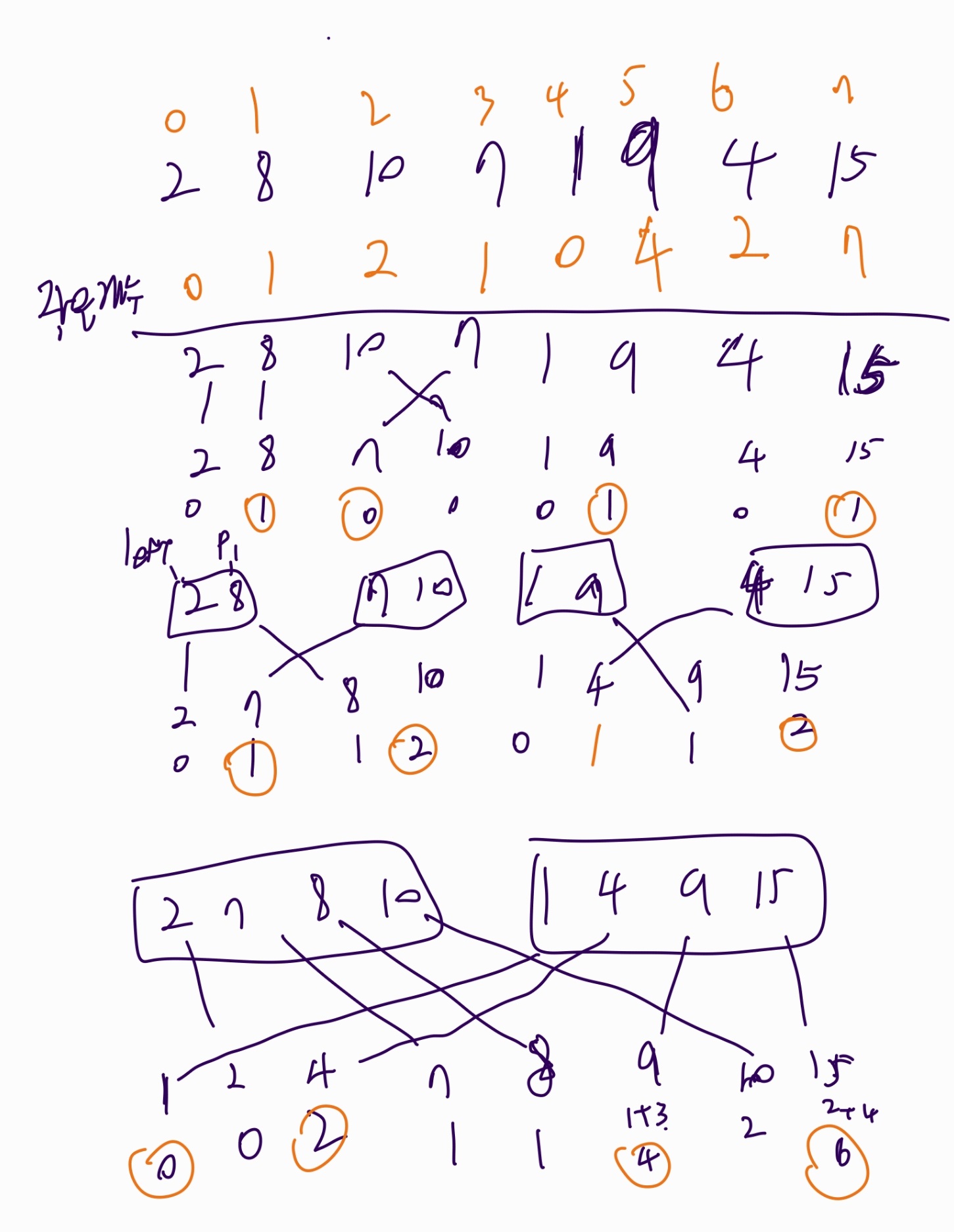 2. 두 배열을 병합할때 RIght 배열 원소를 삽입 할때 자기 Left 배열에서 현재숫자보다 낮은 개수를 누적합한다.