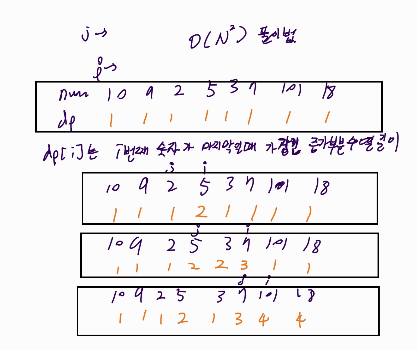 현재 위치 i 에서 , i 보다 왼쪽에 있는 원소들의 dp[j] 값들을 보고 nums[i] > nums[j] 이면(증가하면) 원소값들을 비교하고 업데이트 해준다.