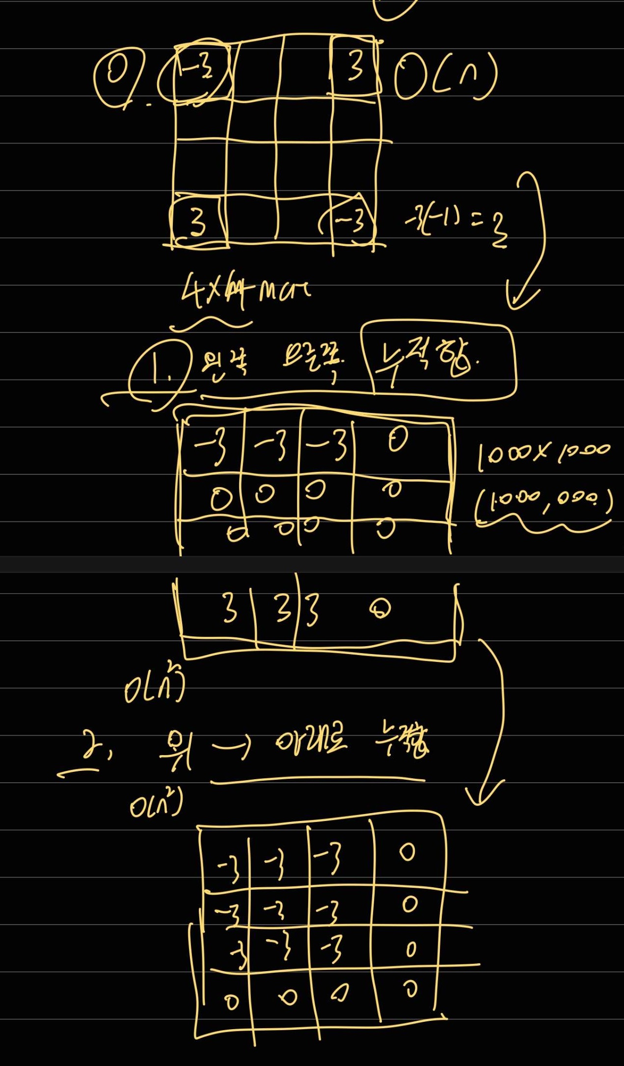이런 식으로 차원 축소하여 누적합을 구하면, 3중 for문을 돌지 않고도 구할수 있다.